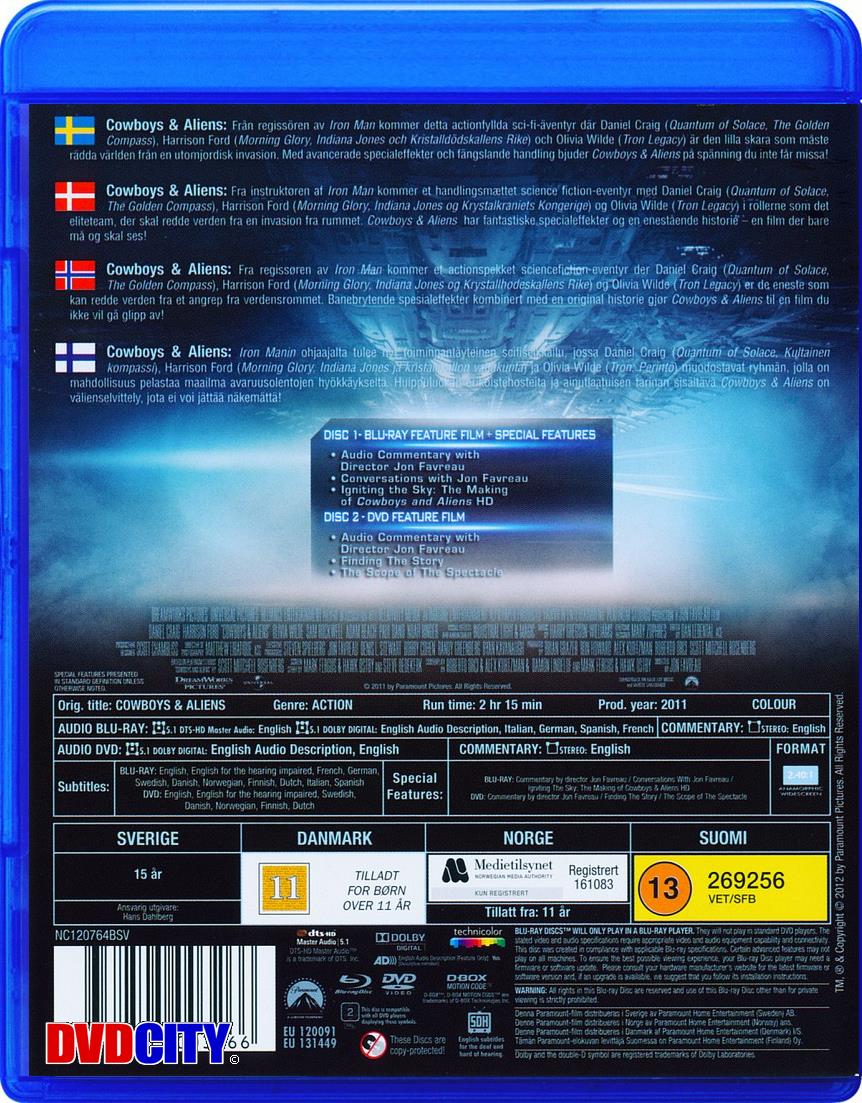 | Beskrivelse: [ Dansk Engelsk ] 1873. Arizona. En fremmed (Daniel Craig) vakler ind i ørkenbyen Absolution. Han kan ingenting huske og indbyggerne virker ikke særligt imødekommende. Det er en by, som lever i frygt og styres med en jernnæve af Oberst Dolarhyde (Harrison Ford). Og byen står over en for en invasion. Ikke af banditter eller en hær, men en invasion fra rummet. Beskrivelse: [ Dansk Engelsk ] Sci-fi meets Western in this Jon Favreau-directed alien adventure based on the 2006 graphic novel by Scott Mitchell Rosenberg. In the 19th-century Wild West, loner Jake Lonergan (Daniel Craig) stumbles into the desolate Arizona desert town of Absolution, which is presided over with a rule of iron by the megalomaniacal Colonel Dolarhyde (Harrison Ford). With no memory of his past and a mysterious shackle around his wrist, Jake soon learns that he is a wanted man - but his predicament is swiftly overshadowed by an invasion of alien marauders intent on abducting the townspeople. With the help of mysterious traveller Ella (Olivia Wilde), Jake pulls together a posse of his former opponents - who, now united against a common enemy, prepare to fight for the survival of humankind. | Ekstra features:
