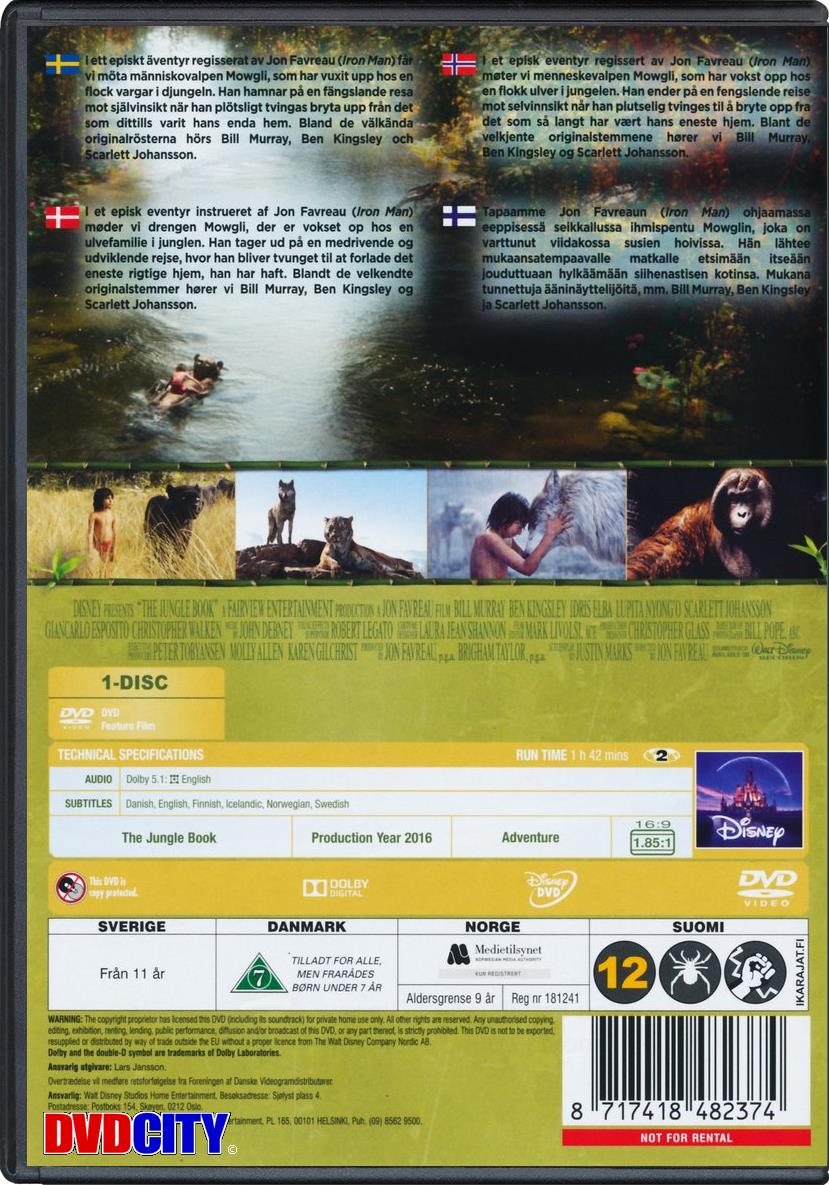 | Beskrivelse: [ Dansk Engelsk ] I et episk eventyr instrueret af Jon Favreau (Iron Man) møder vi drengen Mowgli, der er vokset op hos en ulvefamilie i junglen. Han tager ud på en medrivende og udviklende rejse, hvor han bliver tvunget til at forlade det eneste rigtige hjem, han har haft. Blandt de velkendte originalstemmer hører vi Bill Murray, Ben Kingsley og Scarlett Johansson. Beskrivelse: [ Dansk Engelsk ] Jon Favreau directs this fantasy adventure remake of the 1967 film inspired by Rudyard Kipling's book. The story follows Mowgli (Neel Sethi), a young boy who has been raised by wolves, who is forced to leave the jungle after he is attacked by the terrifying tiger Shere Khan (voice of Idris Elba). After hearing of the death of Akela (Giancarlo Esposito), the leader of the wolves who raised him, Mowgli vows to return to the jungle to confront Shere Khan and end his tyrannical rule once and for all. With the help of bear Baloo (Bill Murray) and panther Bagheera (Ben Kingsley) Mowgli sets off on a dangerous journey with the future of the jungle hanging in the balance. The film also features the voice talents of Scarlet Johansson as Kaa and Christopher Walken as King Louie. |