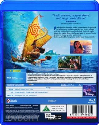 | Beskrivelse: [ Dansk Engelsk ] Fra Walt Disney Animation Studios kommer Vaiana. En fantastisk fortælling om en modig teenagepige, der sætter sejl mod en dristig mission for at redde hendes folk. Undervejs møder Vaiana den engang så mægtige halvgud Maui, og sammen krydser de havet på et sjovt og action fyldt eventyr. En film fyldt med hjerte og humor. Beskrivelse: [ Dansk Engelsk ] Disney animated adventure set in ancient Oceania. When a fiery ocean demon threatens her peaceful island home, teenage Princess Moana (voice of Auli'i Cravalho) vows to fulfil her heroic destiny and save her people. Putting her navigation skills to the test, Moana sets out on a daring sea voyage to find the once-mighty demi-God Maui (Dwayne Johnson), the legendary creator of the Pacific Islands and the only one who can help her with her quest. Together, they traverse the treacherous open waters, encountering difficult conditions and dangerous creatures along the way, as Moana searches for the mythical island which holds the key to completing her mission. The film also features the voice talents of Jemaine Clement, Alan Tudyk and Nicole Scherzinger. The film was nominated for the BAFTA for Best Animated Film, two Golden Globe Awards for Best Animated Feature Film and Best Original Song - Motion Picture (How Far I'll Go), and two Academy Awards for Best Animated Feature and Best Original Song (How Far I'll Go). |