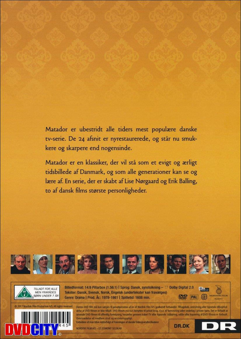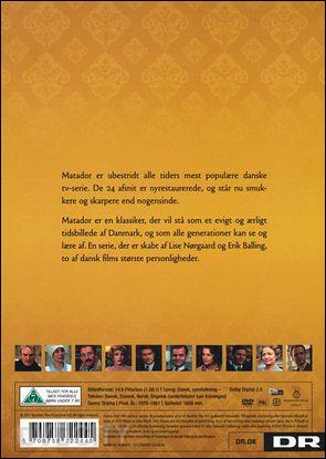 | Beskrivelse: [ Dansk Engelsk ] Matador er ubestridt alle tiders mest populære danske tv-serie. De 24 afsnit er nyrestaurerede, og står nu smukkere og skarpere end nogensinde. Matador er en klassiker, der vil stå som et evigt og ærligt tidsbillede af Danmark, og som alle generationer kan se og lære af. En serie, der er skabt af Lise Nørgaard og Erik Balling, to af dansk films største personligheder.