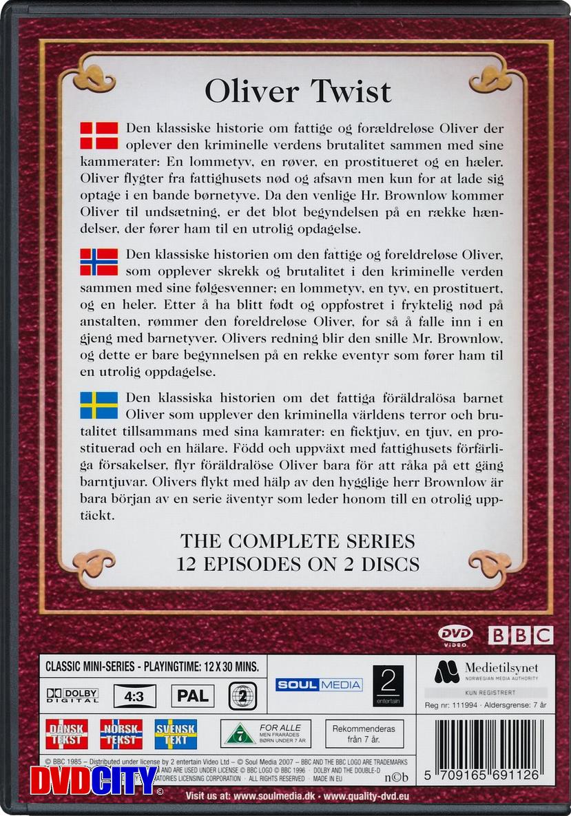 Beskrivelse: [ Dansk Engelsk ] Den klassiske historie om fattige og forældreløse Oliver der oplever den kriminelle verdens brutalitet sammen med sine kammerater: en lommetyv, en røver, en prostitueret og en hæler. Oliver flygter fra fattighusets nød og afsavn men kun for at lade sig optage i en bande børnetyve. Da den venlige hr. Brownlov kommer Oliver til undsætning, er det blot begyndelsen på en række hændelser, der fører ham til en utrolig opdagelse.