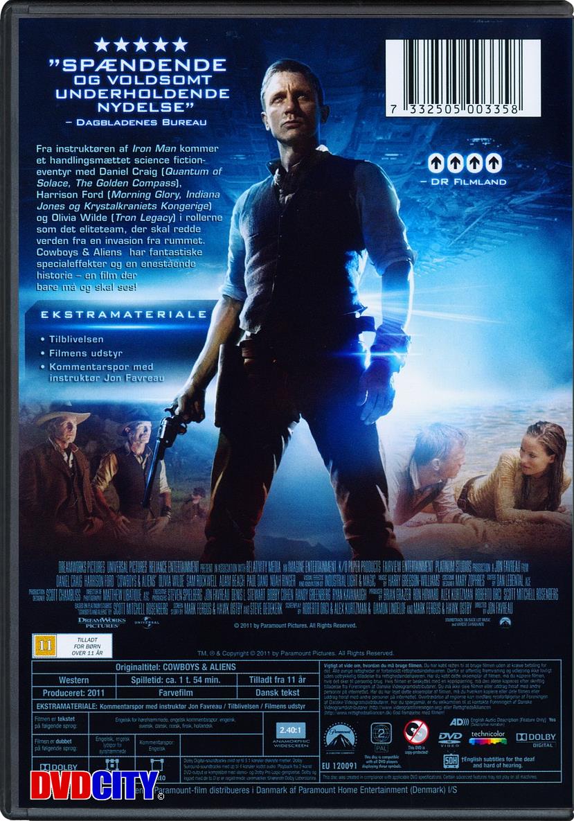 | Beskrivelse: [ Dansk Engelsk ] 1873. Arizona. En fremmed (Daniel Craig) vakler ind i ørkenbyen Absolution. Han kan ingenting huske og indbyggerne virker ikke særligt imødekommende. Det er en by, som lever i frygt og styres med en jernnæve af Oberst Dolarhyde (Harrison Ford). Og byen står over en for en invasion. Ikke af banditter eller en hær, men en invasion fra rummet. Beskrivelse: [ Dansk Engelsk ] Sci-fi meets Western in this Jon Favreau-directed alien adventure based on the 2006 graphic novel by Scott Mitchell Rosenberg. In the 19th-century Wild West, loner Jake Lonergan (Daniel Craig) stumbles into the desolate Arizona desert town of Absolution, which is presided over with a rule of iron by the megalomaniacal Colonel Dolarhyde (Harrison Ford). With no memory of his past and a mysterious shackle around his wrist, Jake soon learns that he is a wanted man - but his predicament is swiftly overshadowed by an invasion of alien marauders intent on abducting the townspeople. With the help of mysterious traveller Ella (Olivia Wilde), Jake pulls together a posse of his former opponents - who, now united against a common enemy, prepare to fight for the survival of humankind. | Ekstra features: